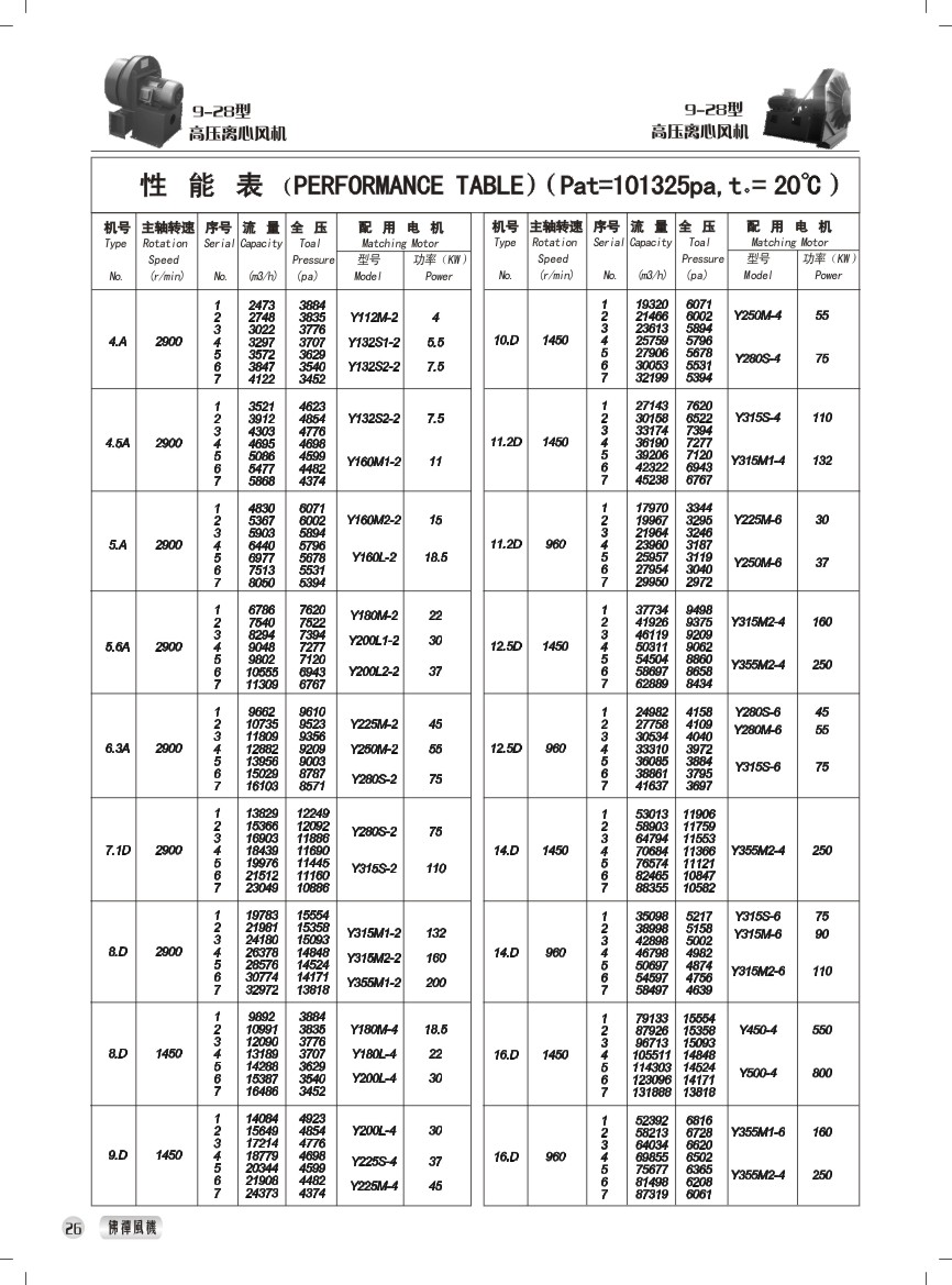 本公司生產(chǎn)的高壓離心 風(fēng)機(jī)有8-09型、9-12型 9-19型,9-20型、9-26型 9-28型、10-16型、10-24 型等型號(hào)。